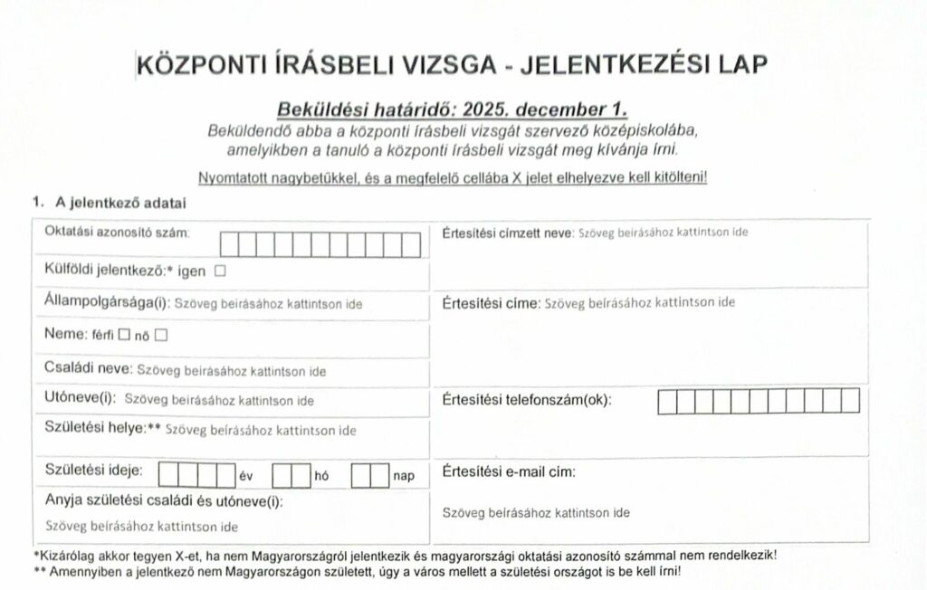 A központi írásbeli felvételi jelentkezési lapot legkésőbb 2025. december 1-ig kell eljuttatni abba a központi felvételit rendező iskolába, ahol a felvételi vizsgát kívánod megírni (Ez nem feltétlenül egyezik meg a kiválasztott iskolával). Azt javasoljuk, hogy ha hozzánk szeretnél jönni, akkor nálunk írd meg a dolgozatot, hiszen így is kicsit belekóstolhatsz az iskola hangulatába, találkozhatsz olyan diákokkal, akikkel talán egy osztályba is jársz majd.