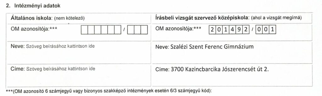Az első pontban a tanuló pontos adatait kell beírni. Kérjük, hogy a személyi igazolványnak / útlevélnek megfelelően tegyétek ezt meg. (Ha esetleg nincs, akkor a születési anyakönyvi kivonatban található adatokat használjátok.). Fontos, hogy a tanuló oktatási azonosító számát is pontosan írják rá. Ez a szám megtalálható a tanuló diákigazolványán.