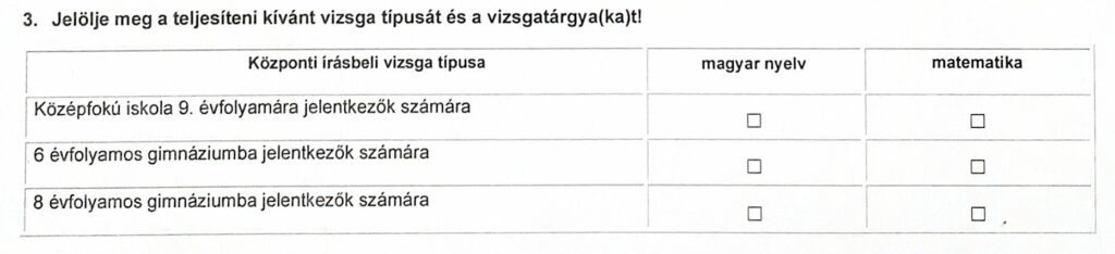 A 3. pontban azt kell jelölni a táblázatban, hogy melyik felvételire jelentkeztek. Figyelem! Mindkét írásbelit meg kell jelölni. Ha a 6 évfolyamosba jelentkeztek, akkor a 2. sort, ha a 4 évfolyamosba, akkor pedig az 1. sort kell kitölteni.
