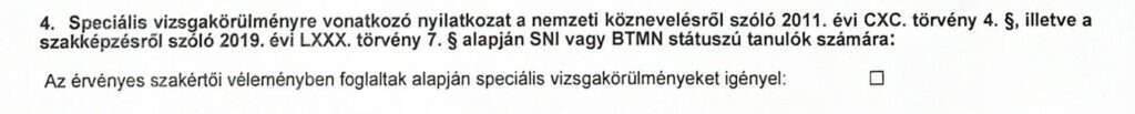 Az 4. pontot csak azok töltsétek ki, akiknek szakértői véleményetek van arról, hogy valamilyen okból (SNI vagy BTM) speciális vizsgakörülményt javasolnak nektek. Erről a szülőnek ÍRÁSBAN kérvényt kell az intézmény igazgatójához benyújtani a jelentkezési lappal együtt. A szülői kérelem itt letölthető. A kérelemhez csatolni kell a szakértői véleményt is.