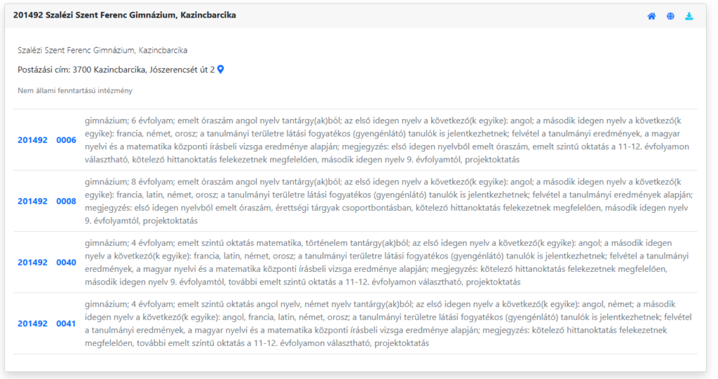 Az „Új jelentkezési adatok” kiválasztásával egy keresési felület jelenik meg, ahol a kiválasztott középiskola OM azonosító számának megadása után a keresés gombra kattintva megjelennek az iskola által meghirdetett tanulmányi területek, amelyek a Szalézi Szent Ferenc Gimnázium esetében a következők: