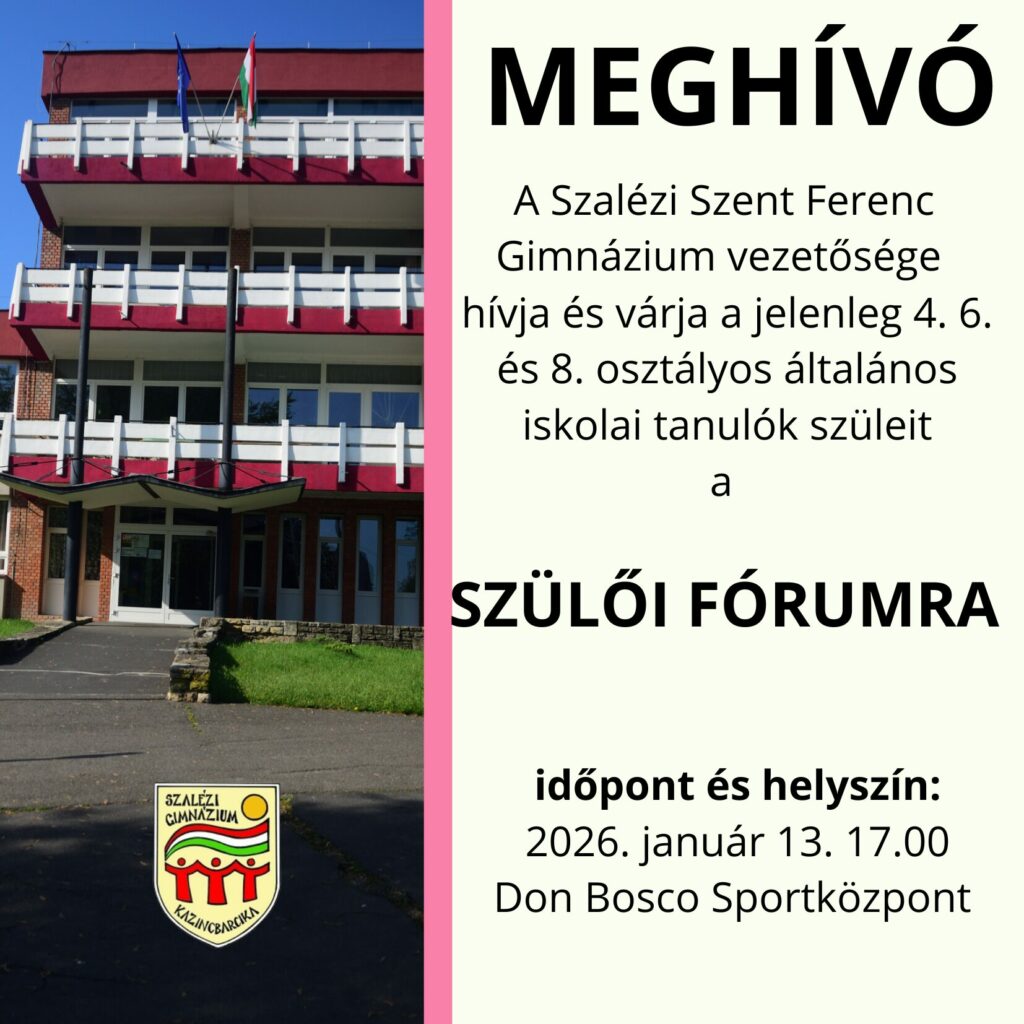 Amint már a nagyközönség is tudja, a Szalézi Szent Ferenc Gimnázium ebben a tanévben indította útjára a nyolcévfolyamos gimnáziumi osztályát, amely nagyon sikeres lett. Jövőre megváltoznak az indított 9. osztályok is, és továbbra is sikeres a 6 évfolyamos képzésünk. Annak érdekében, hogy minél több információt kapjanak, szeretettel várunk minden szülőt, aki érdeklődik az iskolánk iránt egy általános tájékoztatóra és szülői fórumra.