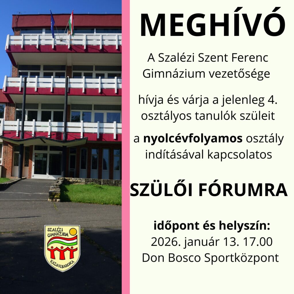 Amint már a nagyközönség is tudja, a Szalézi Szent Ferenc Gimnázium ebben a tanévben indította útjára a nyolcévfolyamos gimnáziumi osztályát, amely nagyon sikeres lett. Annak érdekében, hogy minél több információt kapjanak, szeretettel várunk minden szülőt, aki érdeklődik a képzés iránt egy általános tájékoztatóra és szülői fórumra.